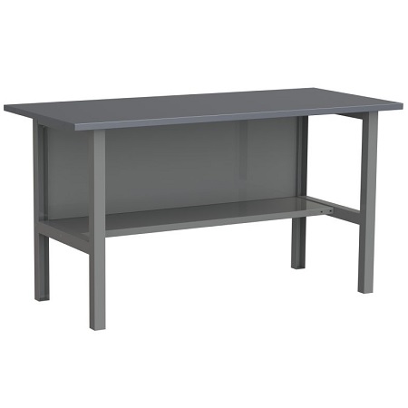 Верстак комплектуется полкой-стенкой, расположенной под столешницей для удобного размещения габаритного инструмента и оснастки. Опорные элементы выполнены сварными из холоднокатаной стали. Все металлические элементы покрыты полиэфирной порошковой краской. Столешница из фанеры толщиной 24 мм, которая покрыта листом оцинкованной стали толщиной 1,2 мм. Глубина столешниц 696 мм. Максимальная масса груза на столешнице - 350 кг.