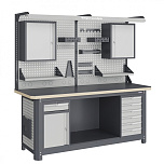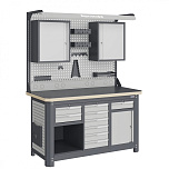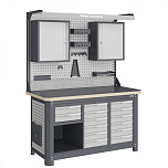 Нагрузка на столешницу 1500 кг. Столешница из листа влагостойкой фанеры марки ФСФ толщиной 40 мм и листом горячекатаной стали толщиной 5 мм. Рама верстака выполнена их холоднокатаной стали. Модуль верстака выполнен сварными. Ящики в модулях устанавливаются на шариковых телескопических направляющих полного выдвижения. Квадратная перфорация для установки крючков, держателей. Размеры: 1982x1493x743 мм