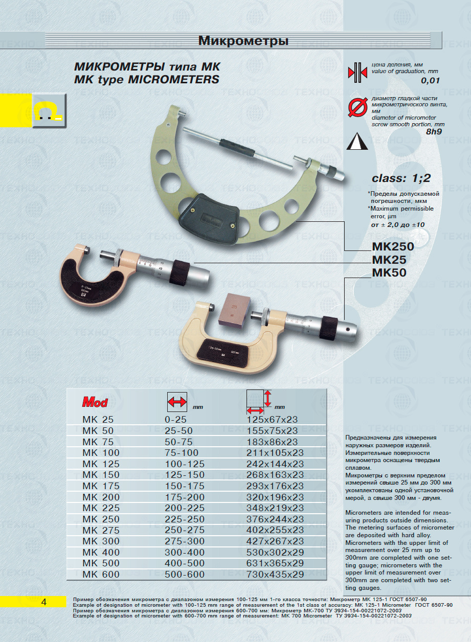 Цена деления 0,01 мм. Диапазон измерения от 250-275 мм. Для измерения наружных размеров изделий. Измерительные поверхности микрометра оснащены твердым сплавом. Микрометры укомплектованы одной установочной мерой. Класса точности 2. ГОСТ 6507-90. Поставляется в двух вариантах с поверкой и без поверки!