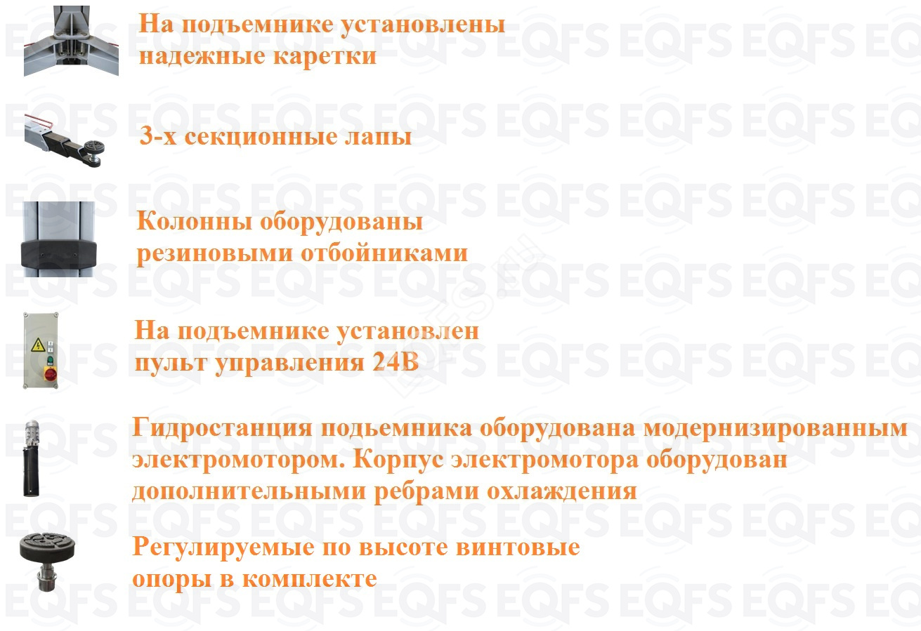 Регулировка высоты подхвата автомобиля производится винтовыми опорами.Поднимает авто с низкой посадкой h-min – 110 мм.